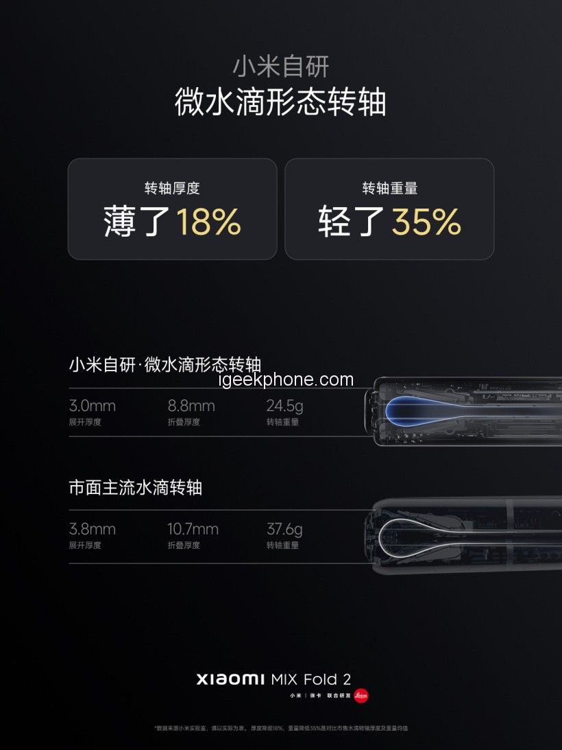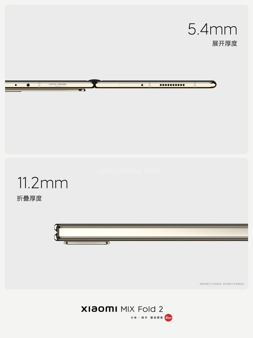 The Xiaomi MIX Fold 2 unfolds as thin as 5.4mm, folds as thin as 11.2mm, and is as light as 262g, with balanced weights on the left and right sides. It has two colors “Xingyao Gold” and “Moon Shadow Black”. Mi MIX Fold 2 is equipped with Xiaomi’s self-developed micro-droplet shaped hinge, which is 18% thinner and 35% lighter; it is equipped with a miniaturized hinge mechanism and super wear-resistant MIM alloy; it also has a carbon fiber double-wing floating plate and a hinge integrated precision process, space three-dimensional stacking, ultra-thin screens, etc.