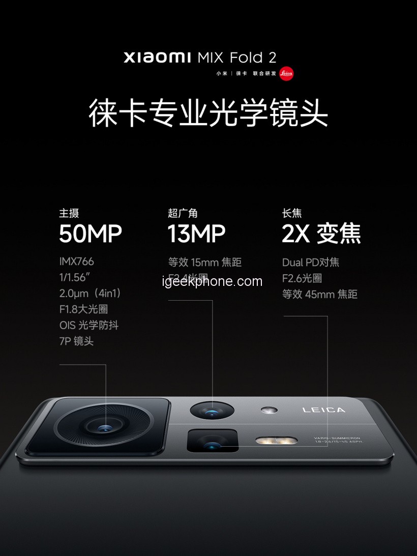In terms of imaging, Mi MIX Fold 2 is equipped with Leica professional optical lens, 7P anti-glare professional coating, equipped with customized ultra-thin 50MP IMX766, the module thickness is only 6.88mm, and supports Leica native dual image quality, master lens package, Xiaomi image brain, and everything tracking. Focus, lightning burst shooting at 30 frames per second, etc.