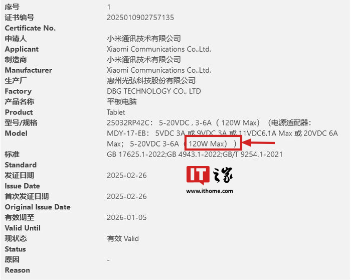 Igeekphone February 27 news, the model of 25032RP42C Xiaomi tablet through 3C certification, support up to 120W fast charge, configuration of MDY-17-EB charger, suggesting that Xiaomi or will launch a positioning higher than Xiaomi mi pad 7 Pro high-end tablet computer.