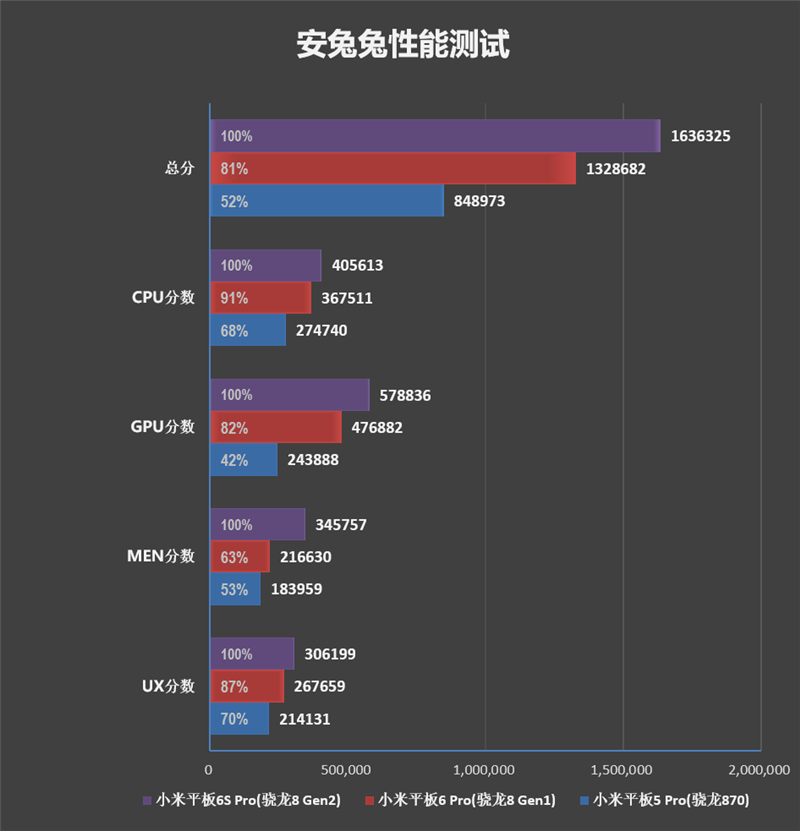Moving on to a direct comparison with the Xiaomi Pad 6 Pro, the Xiaomi Pad 6S Pro 12.4 achieves a 23% higher total score. Surprisingly, it nearly doubles the performance improvement when compared to the Xiaomi Pad 5 Pro equipped with Snapdragon 870, showcasing a substantial 140% GPU performance improvement.