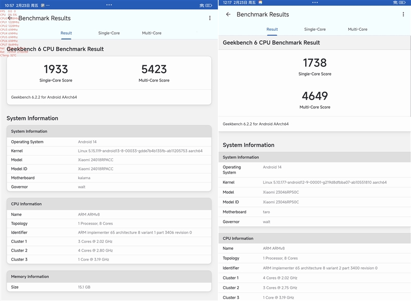 Shifting our focus to the Geekbench 6 test, the Xiaomi Pad 6S Pro 12.4’s single-core performance excels with a score of 1933, while its multi-core performance hits 5423. In contrast, the Xiaomi Pad 6 Pro trails slightly with scores of 1738 and 4649, respectively.