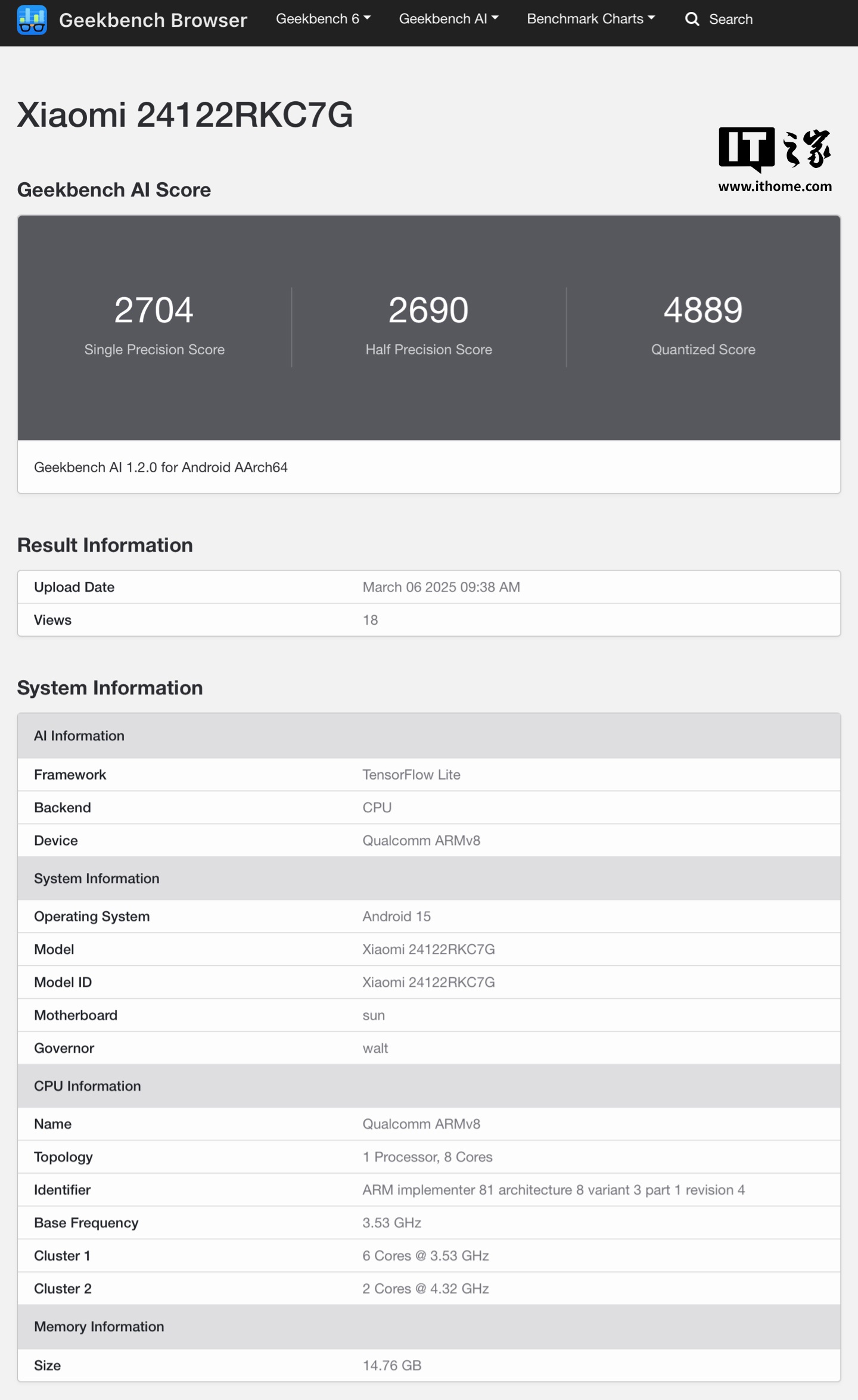 Igeekphone March 7 news, Xiaomi overseas Poco product line in the positioning of the top of the Poco F7 Ultra mobile phone has now appeared in the Geekbench run library, showing that the machine will be equipped with Snapdragon 8 Supreme version processor and 16GB RAM, the specific model of the phone is “24122RKC7G”, The tail suffix “G” indicates that the aircraft will be sold to the global market.
