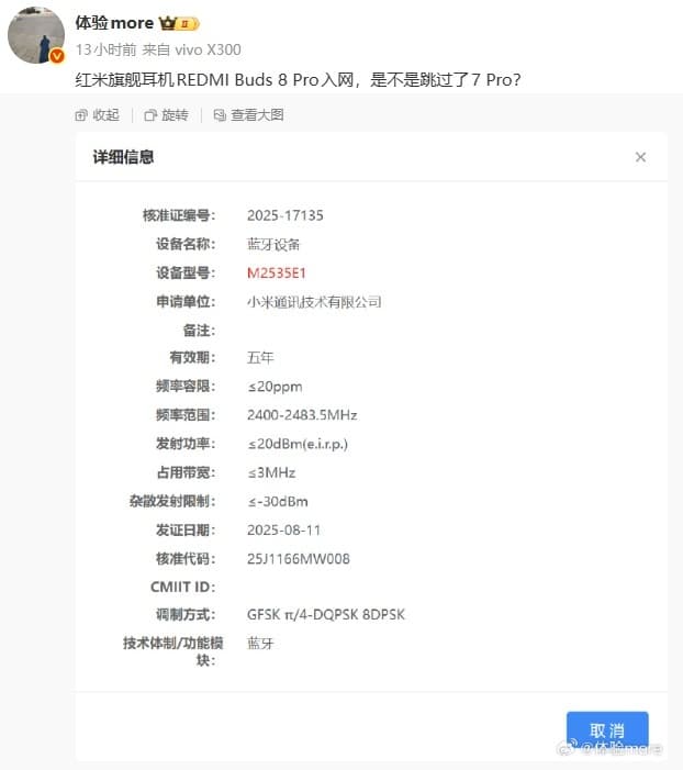 Igeekphone News, November 24th: A new Xiaomi product with the model number M2535E1 passed the radio approval of the Ministry of Industry and Information Technology in August this year. Blogger @Experience more revealed last night that this product is the REDMI Buds 8 Pro headphones.