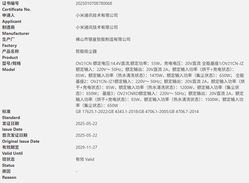 In addition, Xiaomi has another smart vacuum cleaner that has passed the 3C certification and is produced by Foshan Yinxing Intelligent Manufacturing Co., LTD.