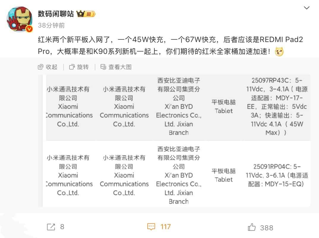 Igeekphone News, August 5th: Blogger @Digital Chat Station posted that two new tablets of Xiaomi REDMI have been approved for network access. The former supports 45W fast charging, while the latter supports 67W fast charging. The blogger revealed that the latter is the Xiaomi REDMI Pad 2 Pro, which is expected to be launched on the same stage as the K90 series phones.
