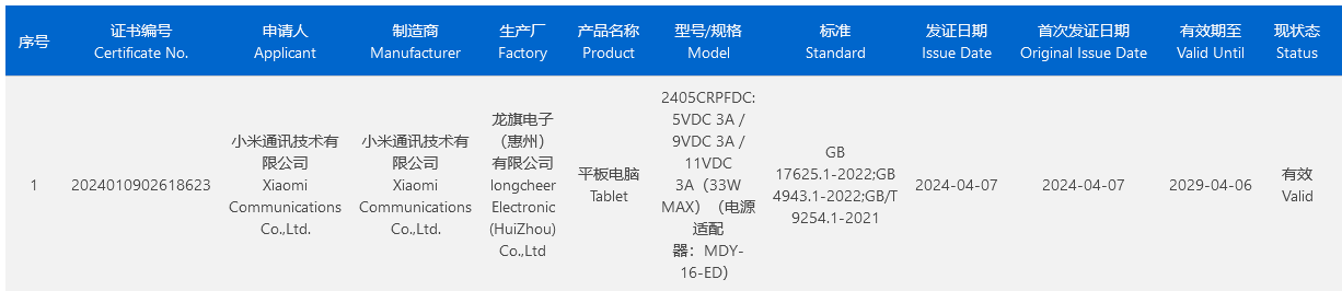 Igeekphone April 8 news, the model of “2405CRPFDC” a Xiaomi tablet appeared in China Quality Certification Center, showing the highest support for 33W charging, should be the Redmi Pad Pro tablet released on April 10.