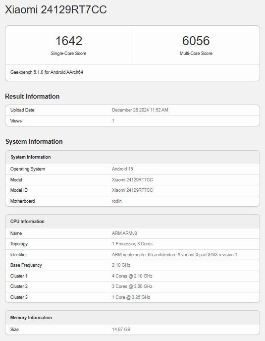 Igeekphone December 27 news, Xiaomi REDMI Turbo 4 mobile phone latest GeekBench run library, 6.1.0 version single-core score of 1642 points, multi-core score of 6056 points.