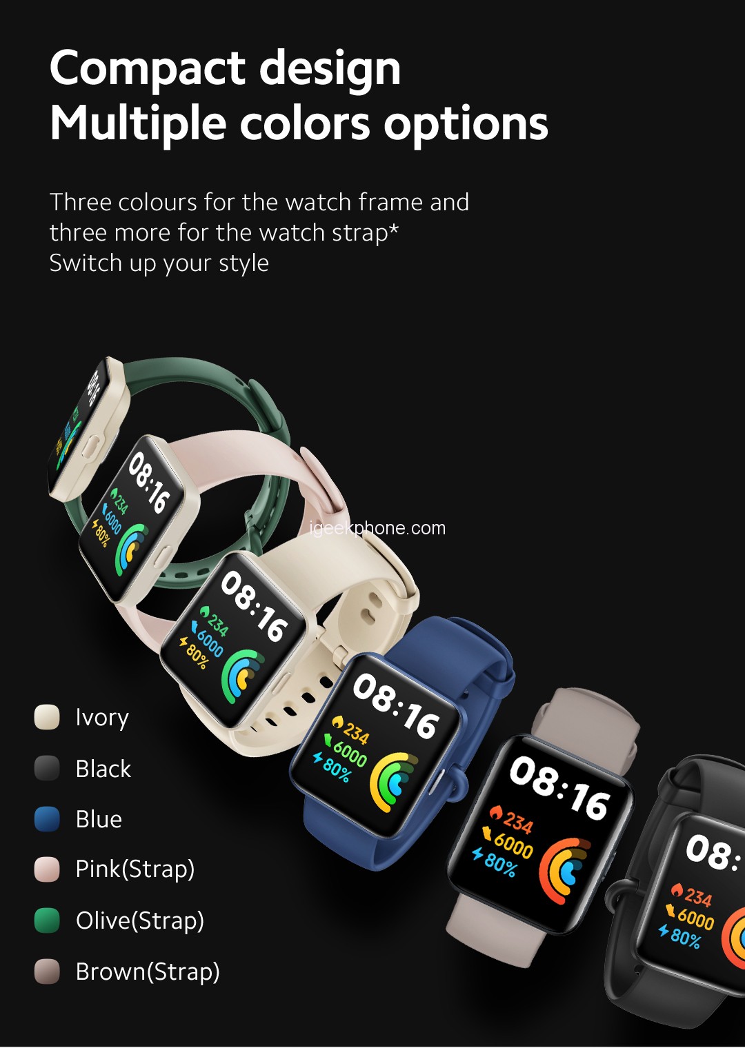Redmi Watch 2 Lite has a square screen with bended corners. A thick casing encompasses the showcase. In any case, the bezel is more slender than the recently sent off Redmi smartwatch. This watch is furnished with a 1.55-inch show, upholds a touch screen, and has a goal of 360 x 320 pixels. Regardless of the bigger presentation and further developed battery, the actual watch is lighter — the weight is diminished by 4 grams to 31 grams. Purchasers can pick between the 3 shades of the watch body and the 6 shades of the TPU lash.