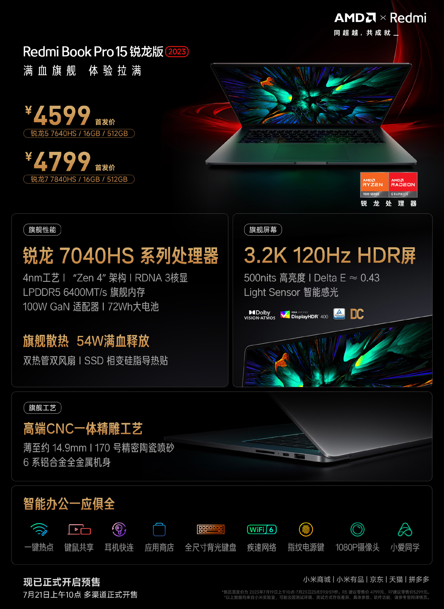 igeekphone July 19 news, Xiaomi RedmiBook Pro 15 Ryzen version 2023 on the pre-sale today, equipped with AMD 7040 HS series processor and 3.2K 120Hz screen, the initial price is as follows: