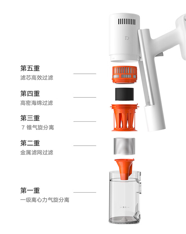 This vacuum cleaner adopts 7 cone cyclone separation device, strong separation of dust and airflow, so that the filter element is not easy to clog, increasing the service life of the filter element. Precision five-fold filtration system, for small to 0.3 micron dust, filtering effect can be up to 99.97%.