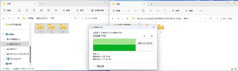 To integrate the Yingruida X8 2TB mobile SSD into the resource manager, right-click the mouse and choose “Map Network Drive.” The host connects to the router’s 2.5Gbps network port using a network cable and proceeds to copy 6GB files from the local computer. The copy speed remains stable at 280MB/s.