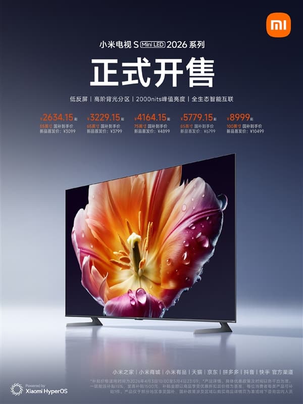 Igeekphone News reported on April 8th: Xiaomi S Mini LED 2026 series has been officially launched for sale tonight. The government subsidy price starts at 2,634.15 yuan.