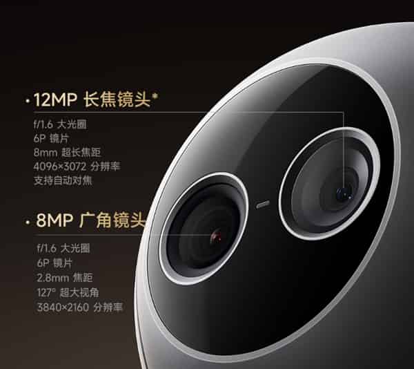 The camera is equipped with a super-clear dual-camera system featuring a 12MP telephoto lens and an 8MP wide-angle lens. Both lenses have an f/1.6 large aperture and 6P lenses. It supports 4K image quality protection and has 12x hybrid zoom and 3x lossless zoom capabilities. It also has ultra-low-light full-color night vision effect, and a new photography mode can capture daily moments.