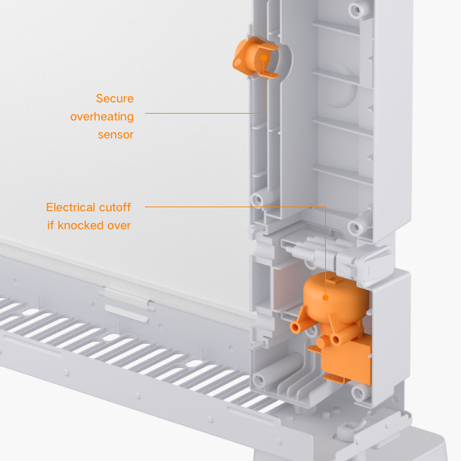 A newly upgraded construction using 72 aluminum heating plates transfers and distributes heat up to an area of up to 46m2. 2200W power means that the room heats up quickly.