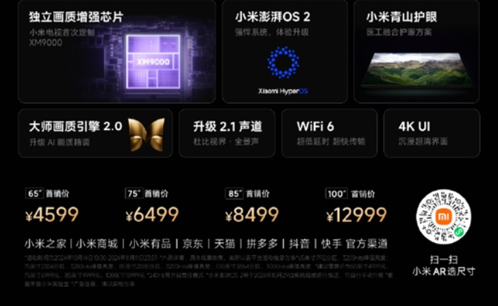 The series is available in 65-inch, 75-inch, 85-inch and 100-inch versions, with hand prices of 4,599 yuan, 6,499 yuan, 8,499 yuan and 12,999 yuan, respectively.