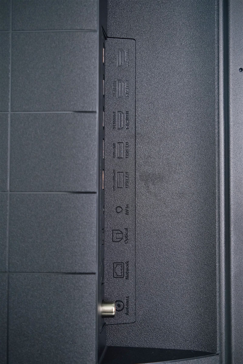 Since it uses a direct backlight, it cannot be made too thin. The thickest part of the lower part is about 8cm, but the S65 Mini LED has a curved design. When viewed from the front, it still feels very thin behind the TV. The I/O interface is on the left, and each interface is labeled. From top to bottom, they are: