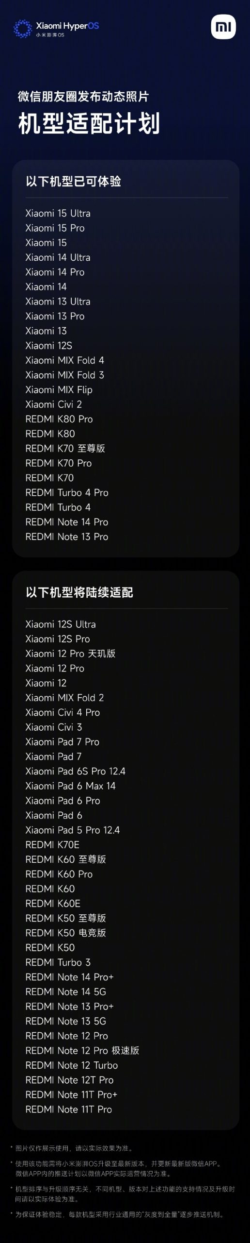 Igeekphone reported on April 25th that recently, Xiaomi announced that the Xiaomi Hyper OS now supports Posting dynamic photos on wechat Moments. At the same time, it also disclosed the model adaptation plan for supporting the Posting of live photos on wechat Moments.