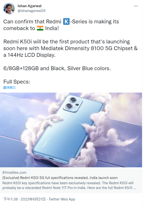 The source, Ishan Agarwal, confirms that the device is entering the Indian market and believes it is a modified version of Redmi Note 11T Pro that was released in China. This means the Redmi K50i phone will be equipped with a Dimensity 8100 chip, a 6.6-inch IPS LCD 144Hz screen, 67W quick charge and a 5000mAh battery.