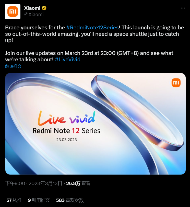 Now, Xiaomi has announced that it will hold the “third time’s a charm” launch event on March 23 (23:00 Beijing time), with the slogan “Live vivid”, which will bring the new Redmi Note 12 series to overseas users.