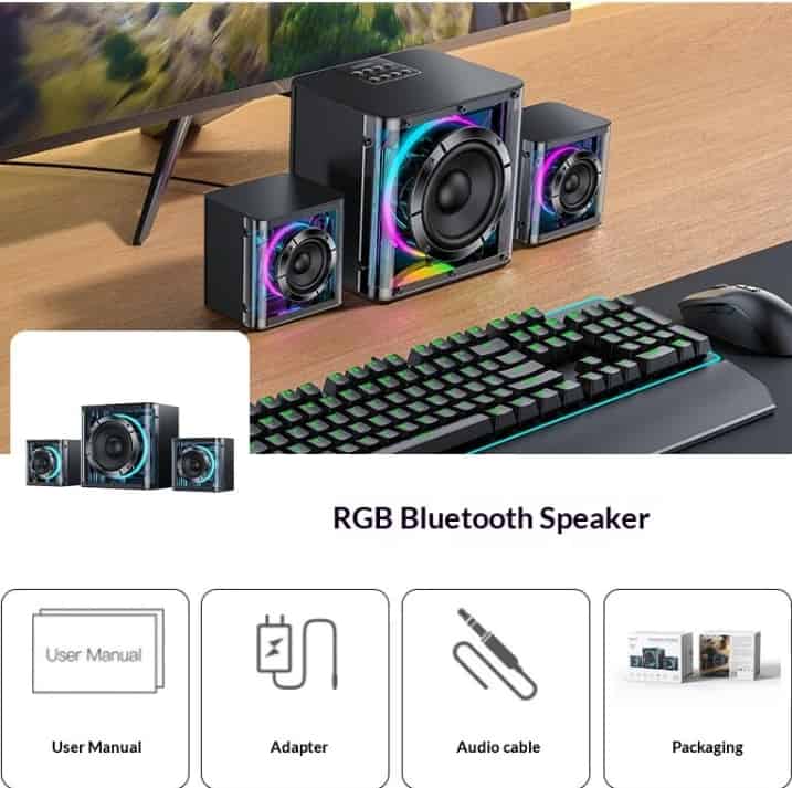 Yesido YSW41 is a 2.1-channel Bluetooth speaker system that combines immersive audio performance with flexible connectivity and eye-catching RGB lighting — making it more than just a speaker, but a centerpiece for your multimedia setup.