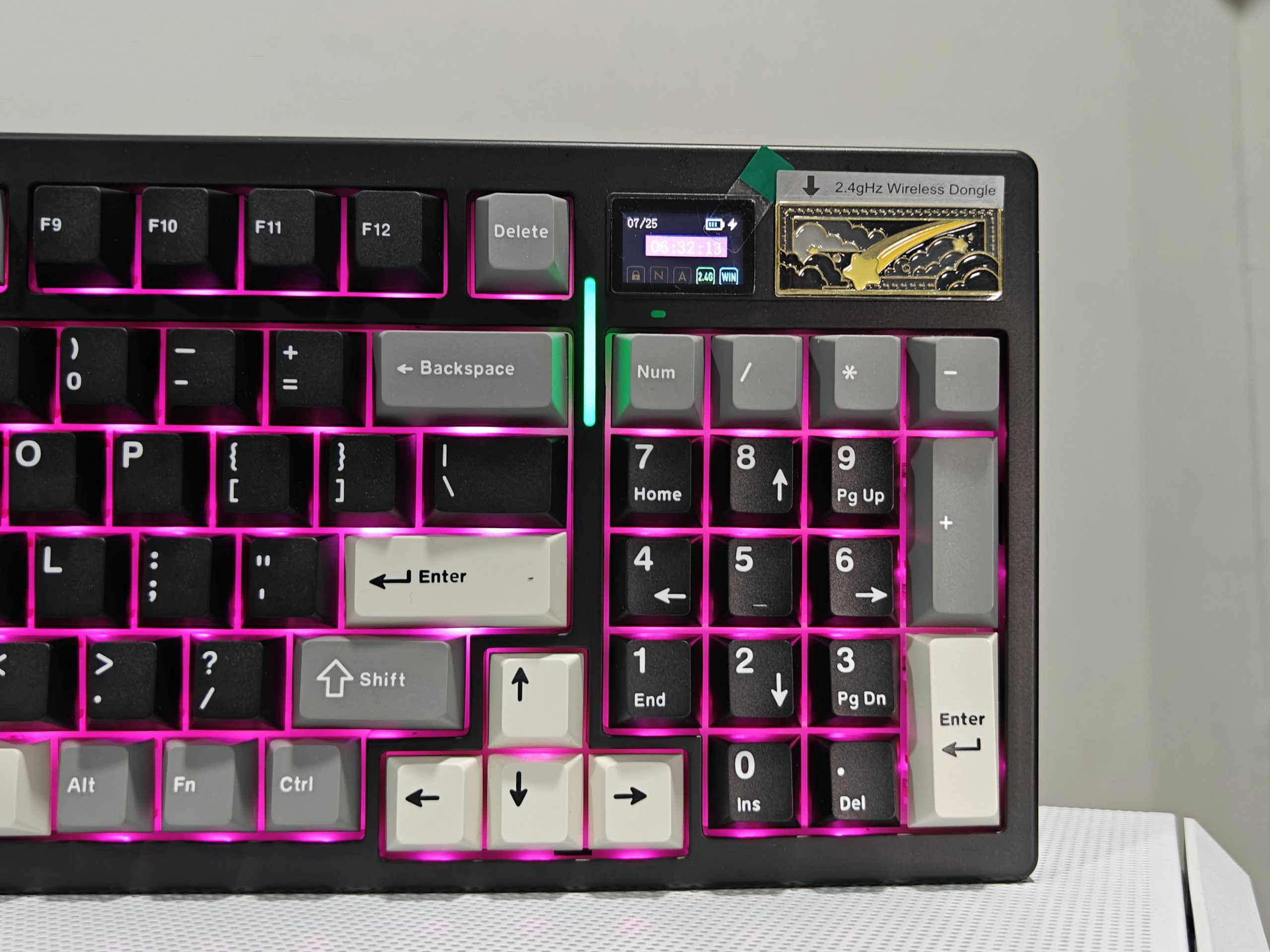 The frame is made from high-quality plastic with smooth, rounded edges. But what makes this keyboard stand out are the thoughtful design details. Take the magnetic aluminium badge on the top right — it looks sharp and doubles as a clever storage spot for the 2.4GHz receiver. Smart, right?