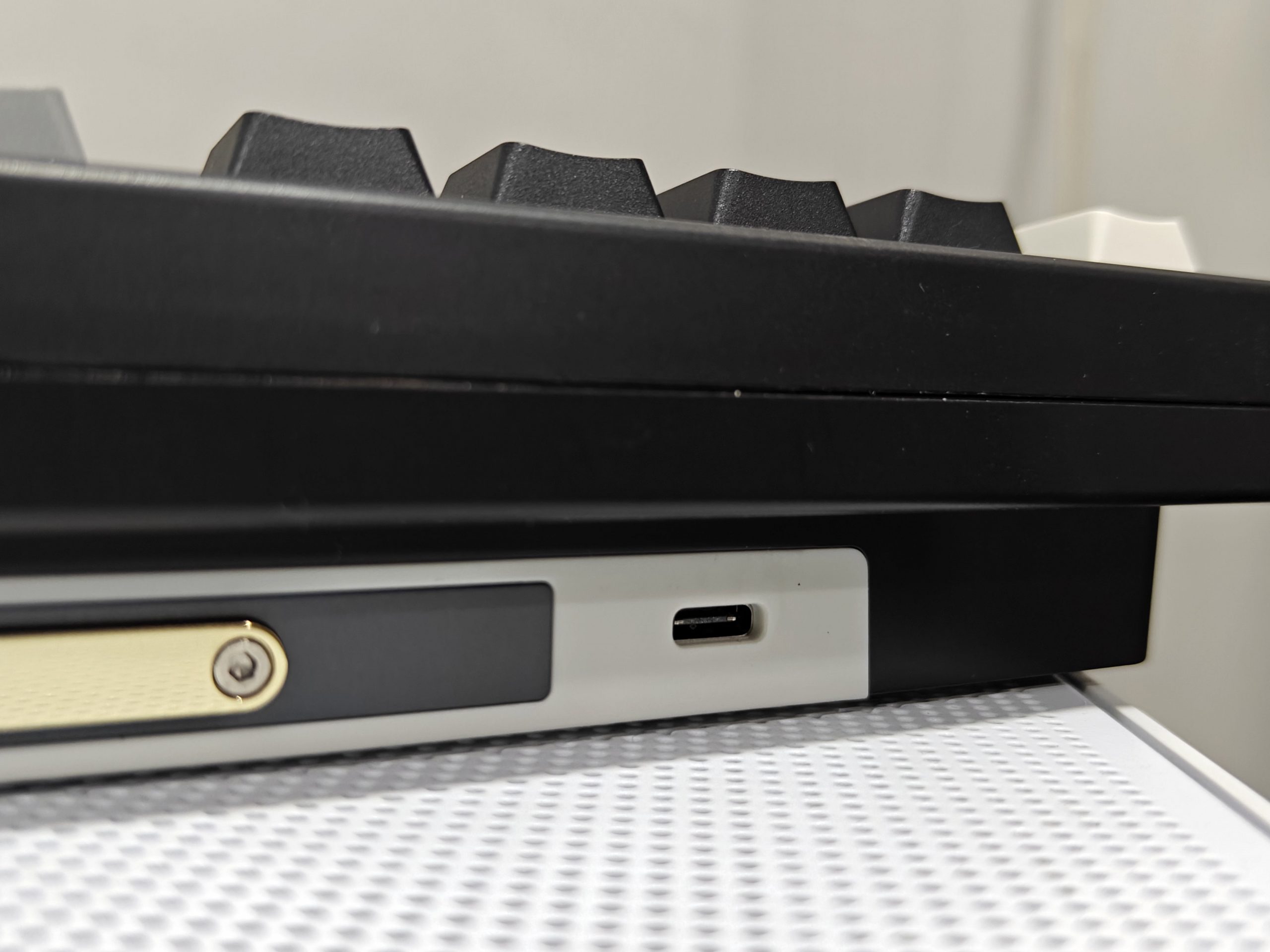 You’ll also find the Type-C port back there, plus rubber feet at each corner to keep the keyboard firmly in place. There’s even a toggle switch to quickly move between Bluetooth, 2.4GHz wireless, and wired modes — super convenient.