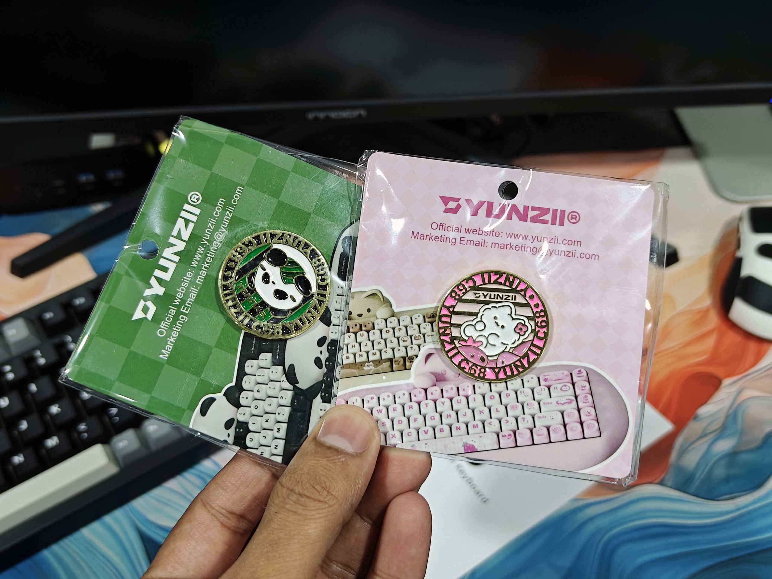 - And a cool little surprise: a metal badge inspired by YUNZII’s C68 keyboard (one pink, one green), mounted on a card with their website and email—super cute and collectible