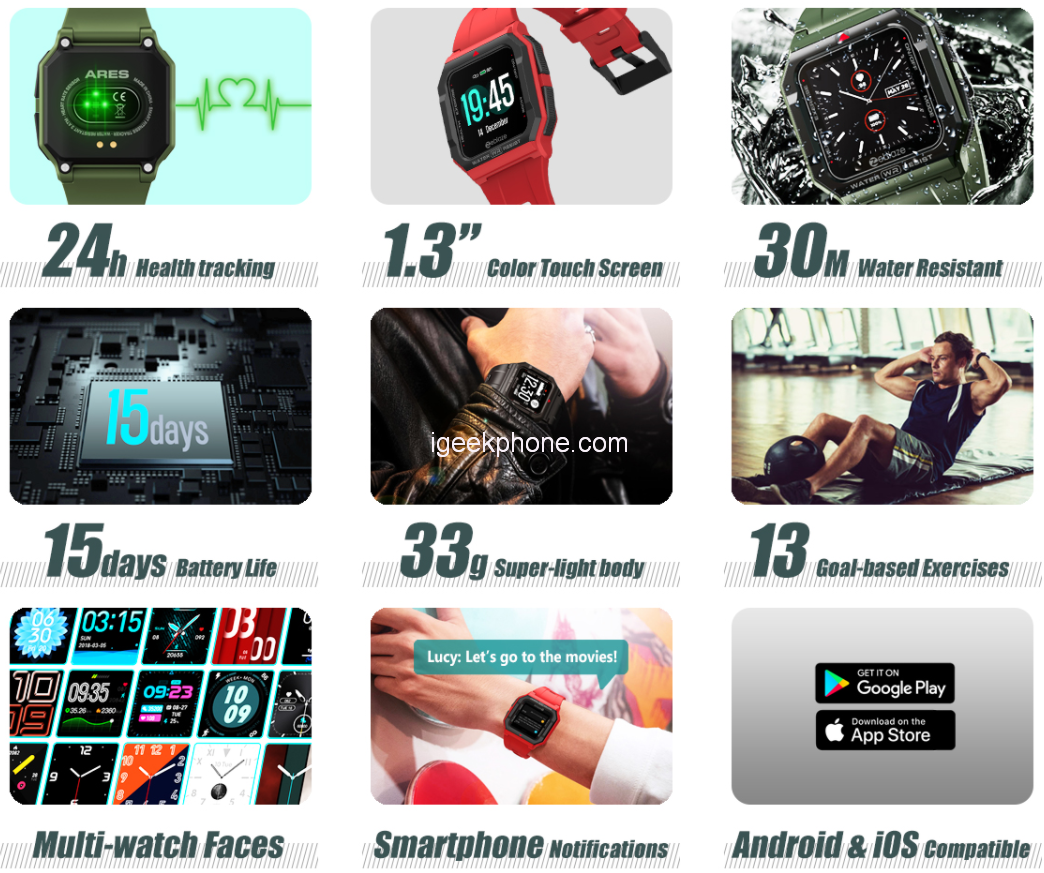 The Zeblaze Ares appears as though one of the exemplary games smartwatches from Casio. It has an outside look with a vibe of retro with its exemplary plan. It weighs 33 grams with strong PC body is 3 ATM waterproof. It has two actual buttons as an afterthought however it additionally upholds contact screen activity. Zeblaze Ares accessible in green, orange, and exemplary dark, the smartwatch has an alluring look. n. The Zeblaze Ares smartwatch has a delightful 1.3″ inch IPS LCD variety screen with a 240 x 240-pixel goal.