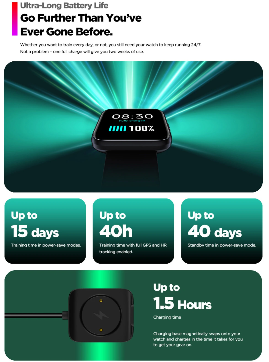 The 180 mAh battery provides up to 40 days of battery life in Power Saver mode or up to 40 hours with continuous GPS usage and charges in about 1.5 hours.
