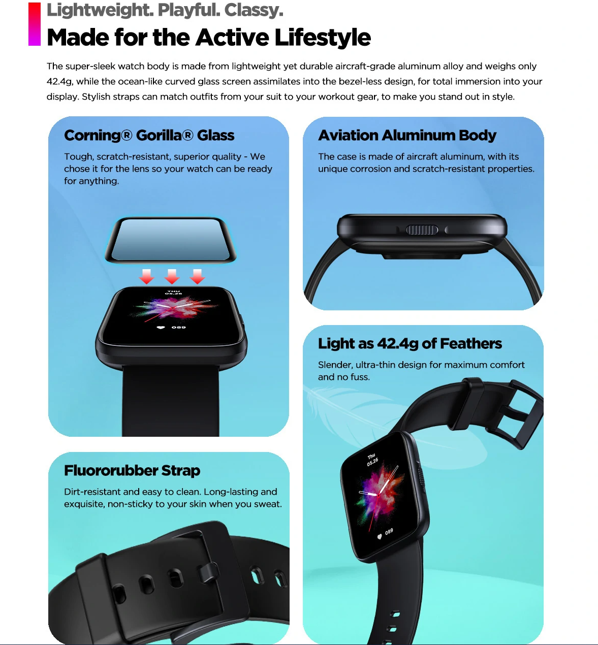 Zeblaze Beyond 2 is a stylish watch designed for an active lifestyle. It weighs only 42.6 grams, and its sports and training features make it a perfect assistant for keeping track of your training routine. It has features like step and distance tracking, a stopwatch, a calorie counter, a heart rate monitor, and more. The design of the Zeblaze Beyond 2 has been seen before and offers no surprises. You get a square smartwatch of 45 x 37 x 10.5 mm. The watch weighs 23.8 g without the strap and 42.4 g with the belt.
