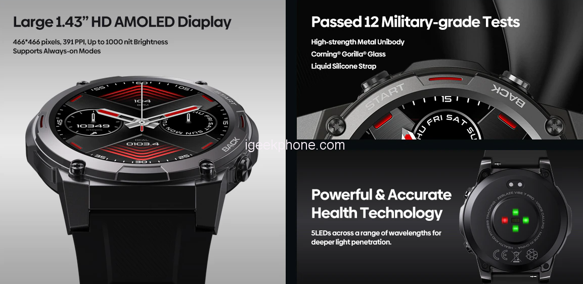 The Zeblaze Vibe 7 Pro Smartwatch has a sleek and stylish design that is perfect for both casual and formal wear. It features a 1.43-inch full-color touchscreen display that is easy to read and navigate, even in bright sunlight. The watch is made of durable and water-resistant material, making it suitable for outdoor activities and sports. It also comes with a comfortable and adjustable silicone strap that is perfect for all-day wear.