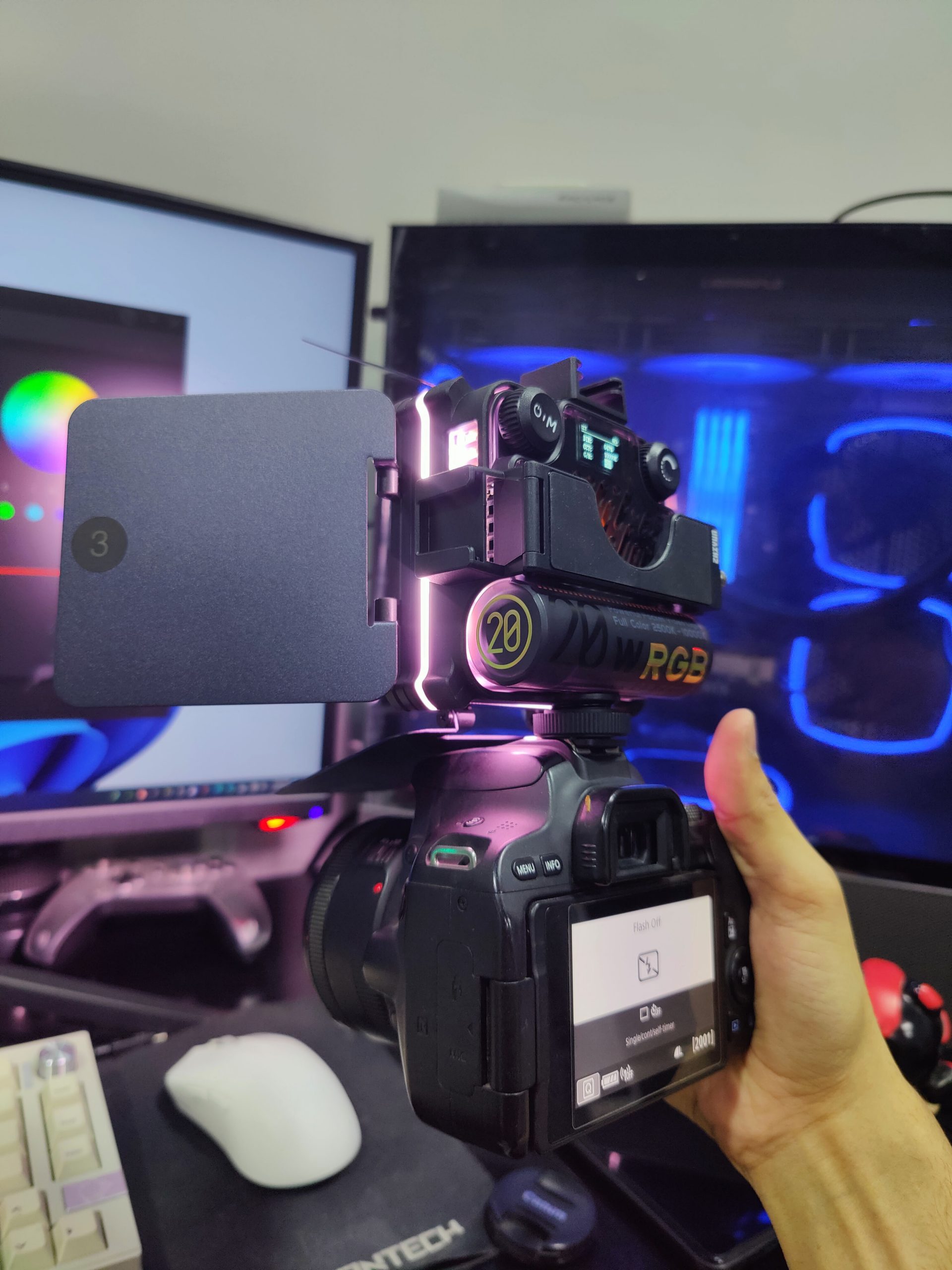 The M20C brings a cool upgrade with its colorful RGB lighting. You get a bunch of different colors to play with, and you can tweak them just right with the dimming feature. There’s even a Green-Magenta control for balancing colors in photos and videos.