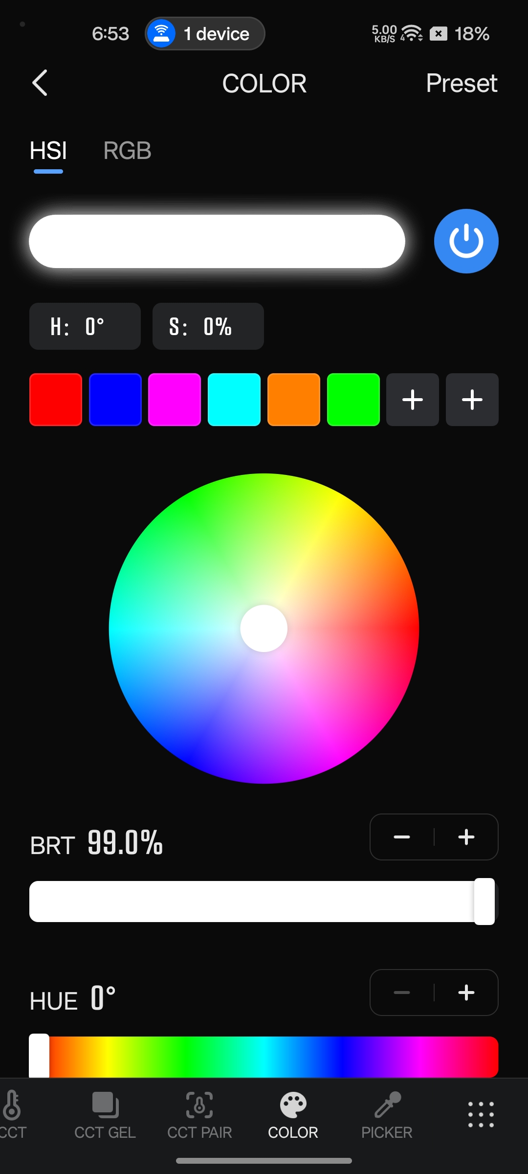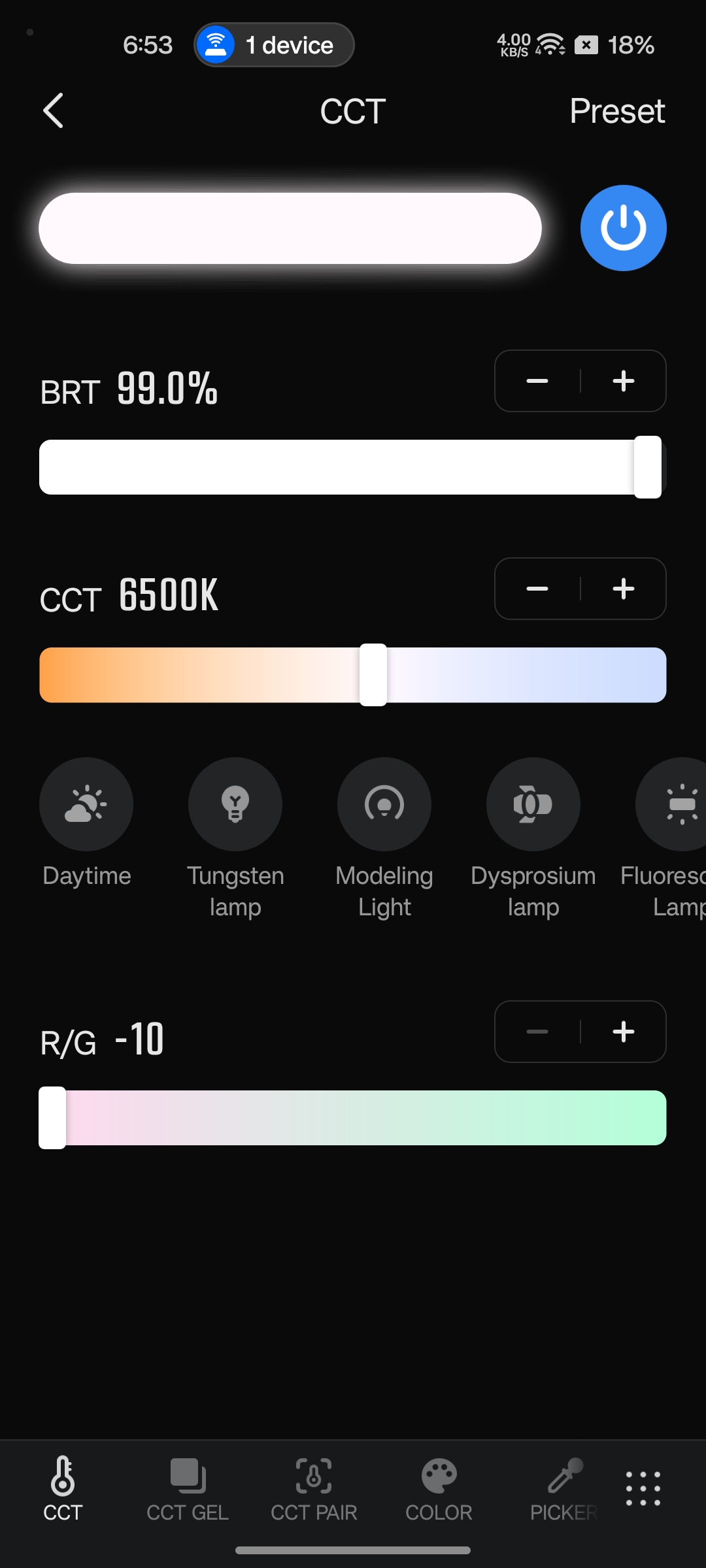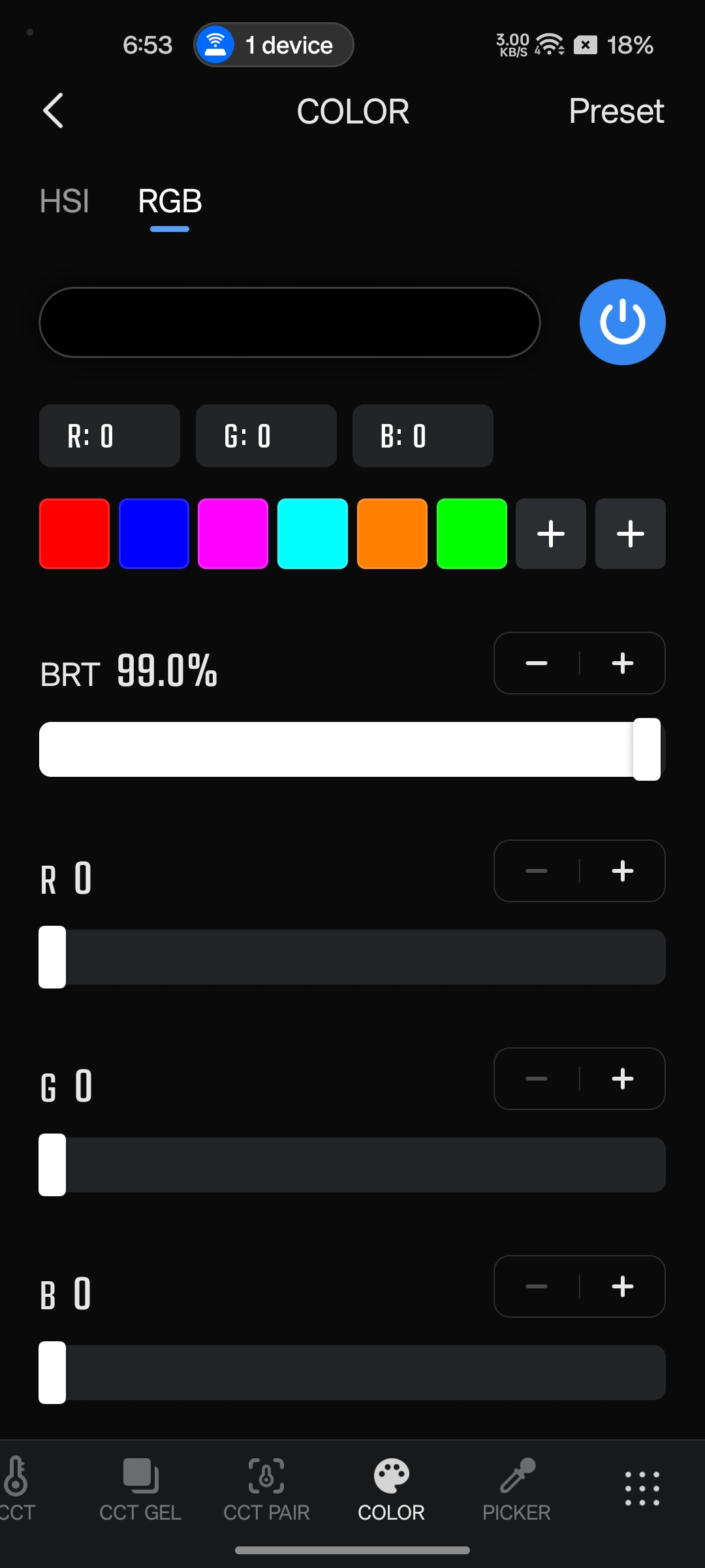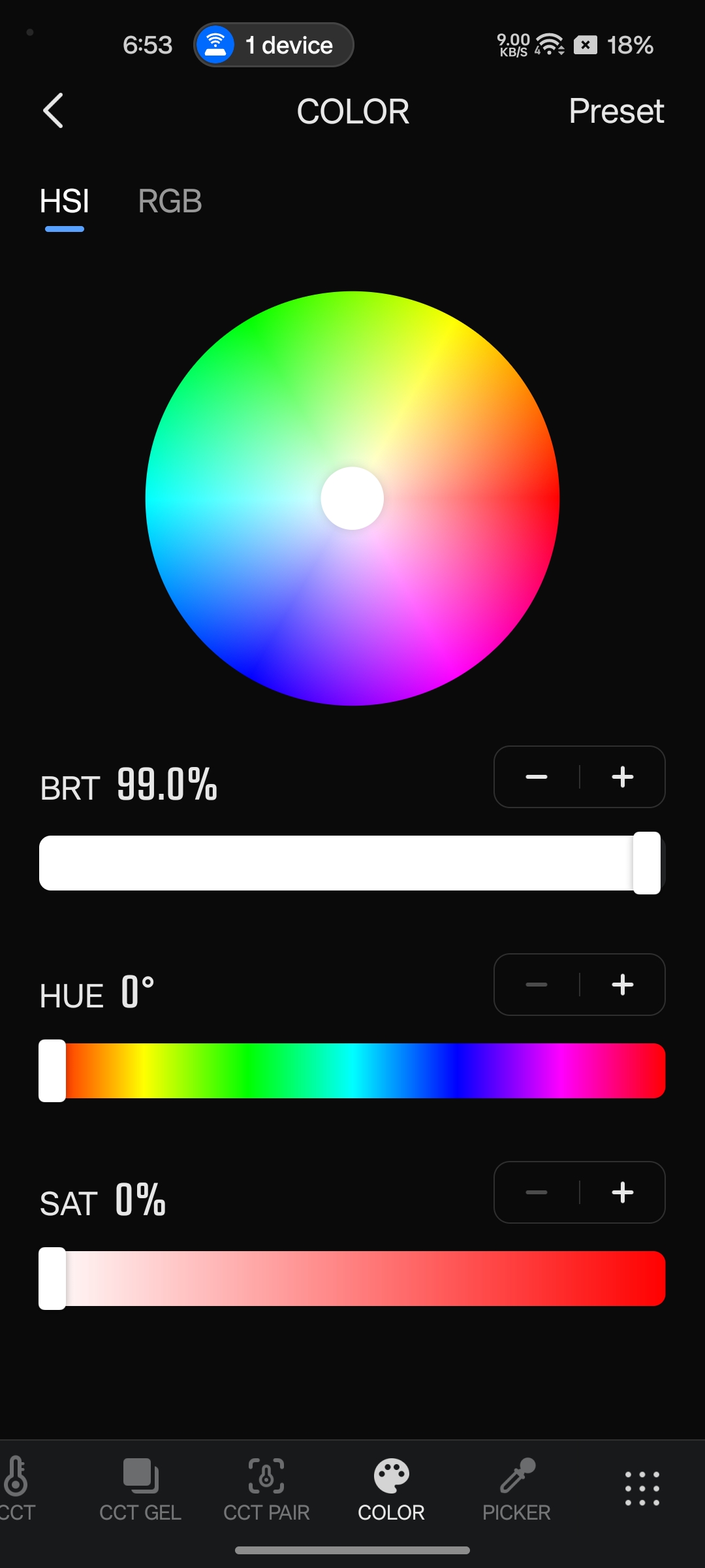 This control scheme is intuitive and user-friendly. The dials offer resistance, minimize accidental adjustments, and require deliberate turning to effect significant changes. An inadvertent twist typically results in only a slight adjustment, mitigating errors. However, transitioning from HSI color mode back to normal CCT requires cycling through all modes, including the settings menu, which can be a minor inconvenience.