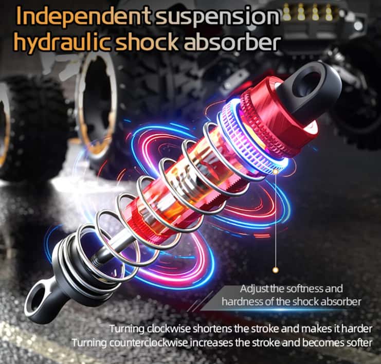 The oil-filled shocks absorb the bumps and jumps, allowing for a smoother ride across rugged terrains. Whether you’re cruising through dirt paths or rock-crawling over obstacles, the suspension system performs excellently, keeping the car stable and preventing it from bouncing uncontrollably.