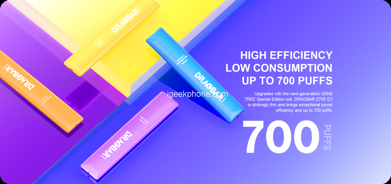 Ultra-thin DRAGBAR Z700 GT brings exceptional power efficiency and up to 700 puffs. It is the new peak of puffs in 2ml disposable products on the market, enjoying a more stable and lasting vaping experience.
